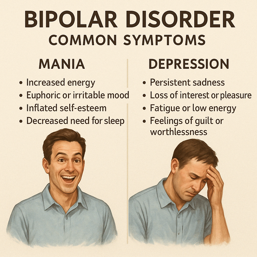 Bipolar disorder is a mood disorder marked by shifts in energy, mood, and activity levels that range from depressive lows to manic highs. It’s highly treatable, and with the right support, individuals can lead stable and fulfilling lives.