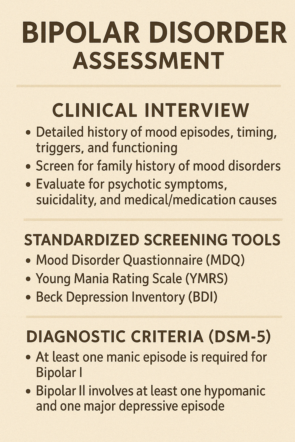 - Detailed history of mood episodes, timing, triggers, and functioning